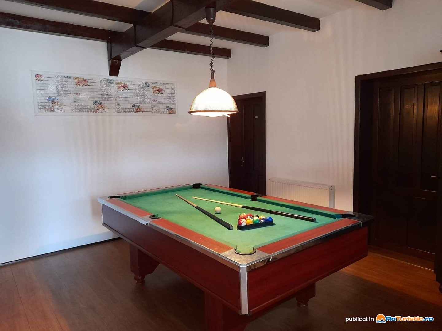 La parter, oferim o bucătărie complet utilată, baie de serviciu cu WC și mașină de spălat rufe, living cu TV și canale prin satelit, DVD player, loc de servire a mesei cu ieșire la o terasă de 80 mp dotată cu masă de biliard, tenis de masă și hamac.