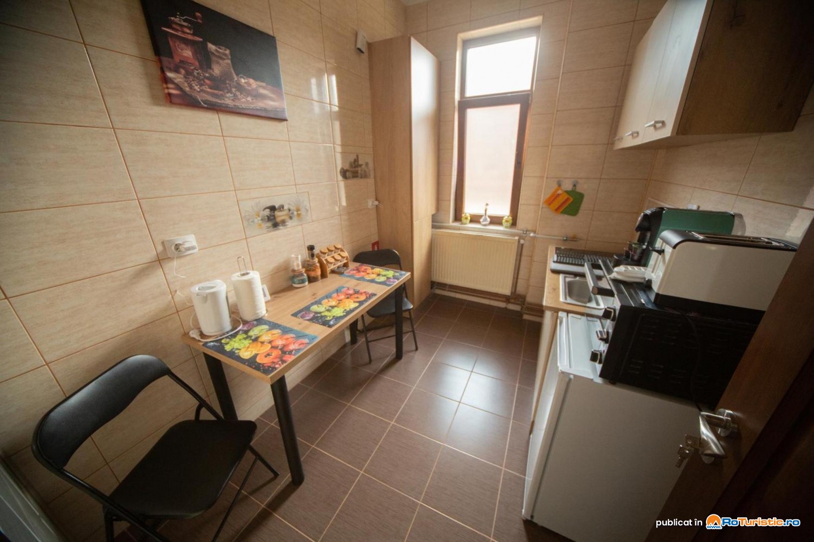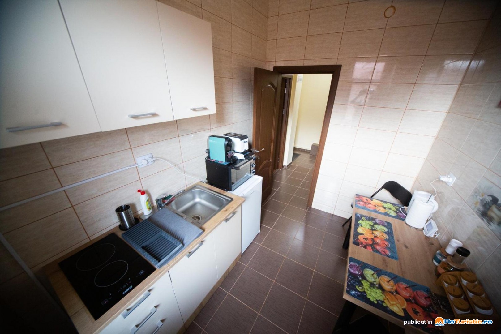 Camerele duble dispun și de o mini chicinetă dotată cu mașină de cafea, cană electrică și cuptor cu microunde. Apartamentul este dotat cu o bucătărie complet utilată, living cu TV și două canapele extensibile.