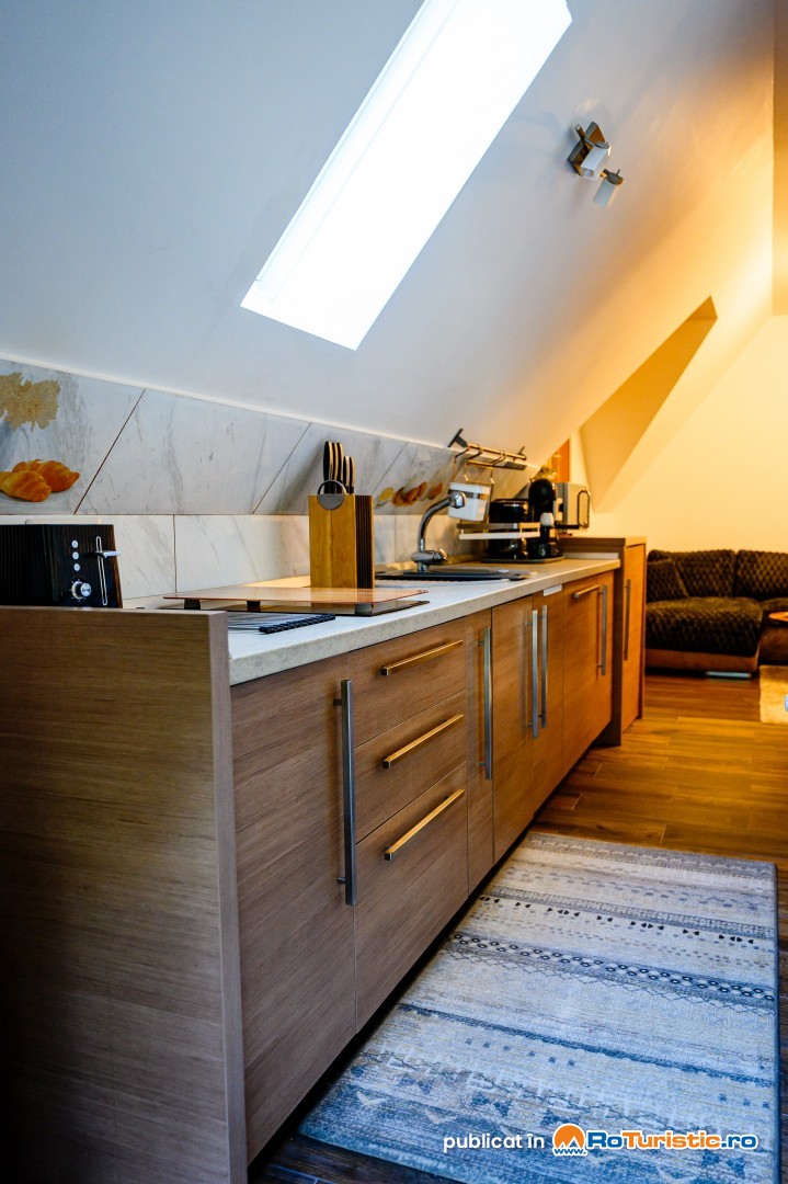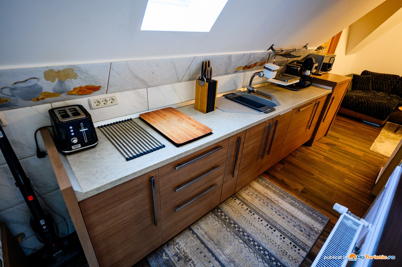 Apartamentele sunt dotate cu bucătărie complet utilată, frigider, plită cu inducție, vase, cuptor cu microunde, espressor, filtru de cafea, prăjitor de pâine, mașină de spălat rufe, fier și masă de călcat, precum și aspirator.