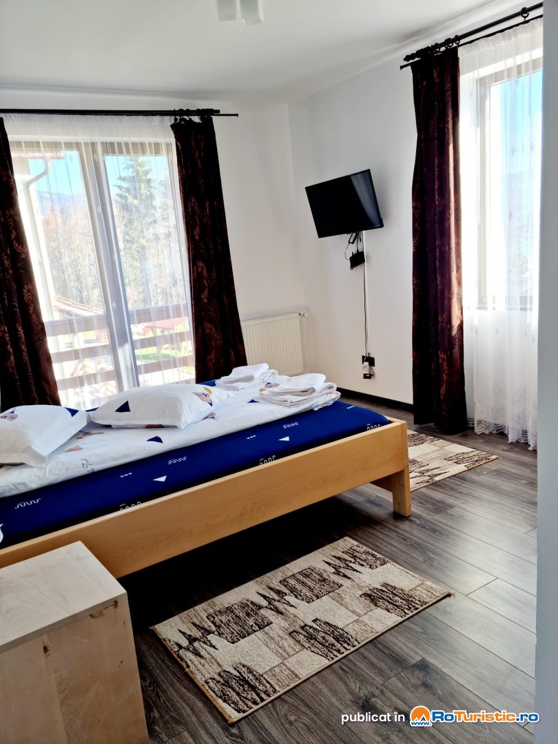 În plus, oaspeții beneficiază de un salon spațios, cu zonă de relaxare cu TV, zonă pentru luat masa, baie de serviciu, precum și de o bucătărie comună și o terasă cu vedere spre lac și munte. Capacitatea pensiunii este de 9 persoane, cu posibilitatea de extindere.