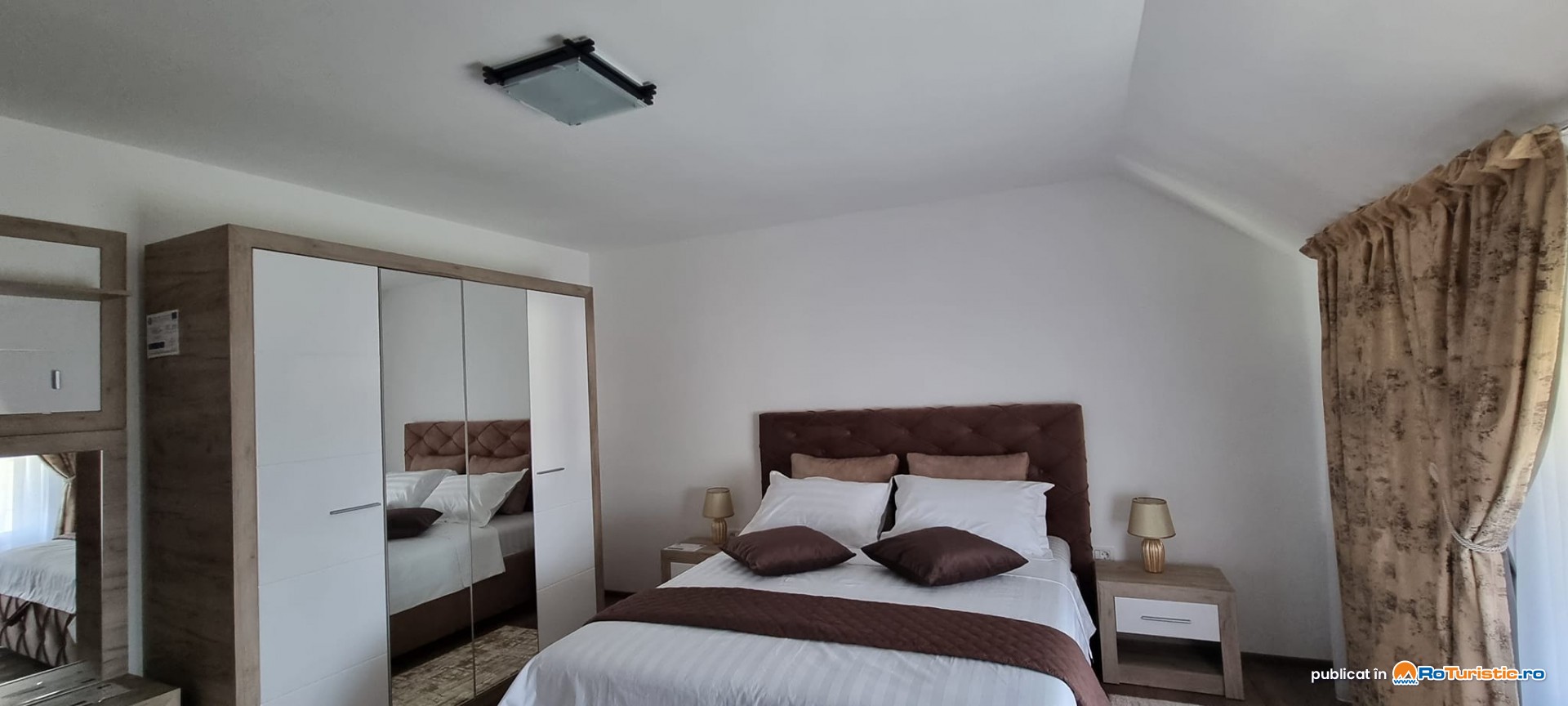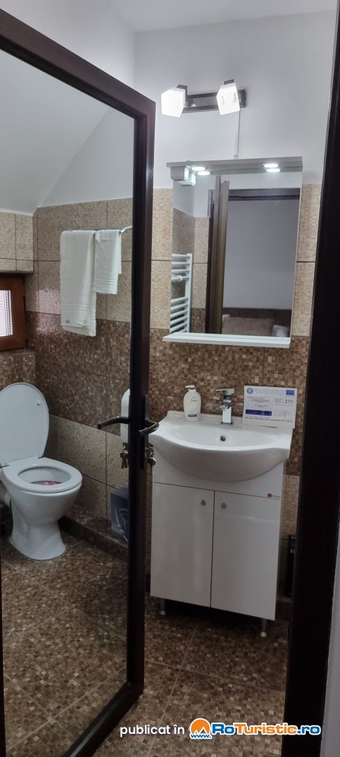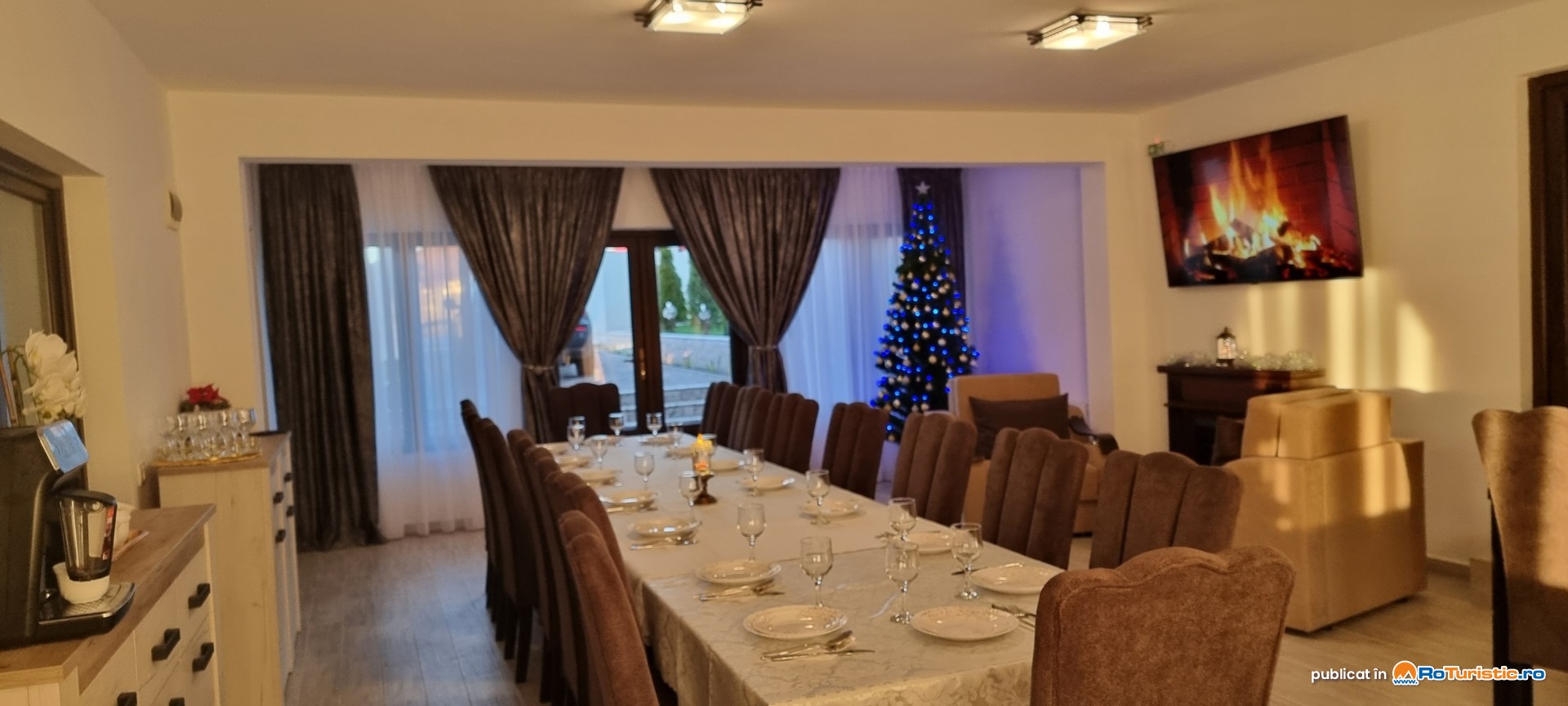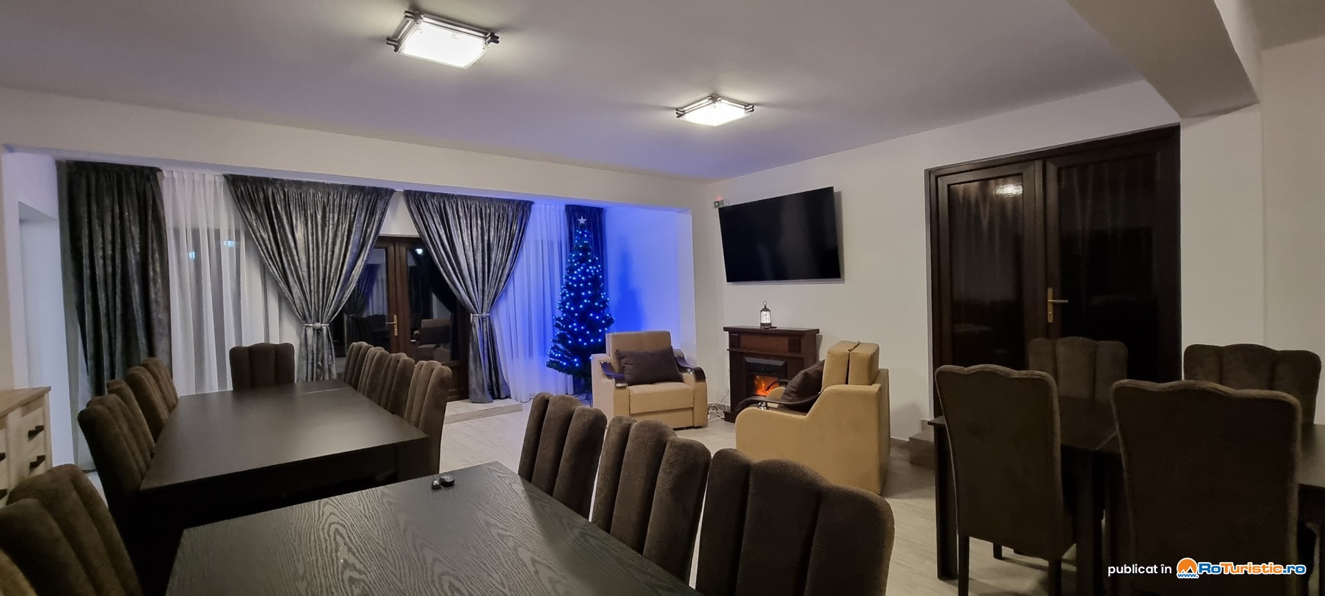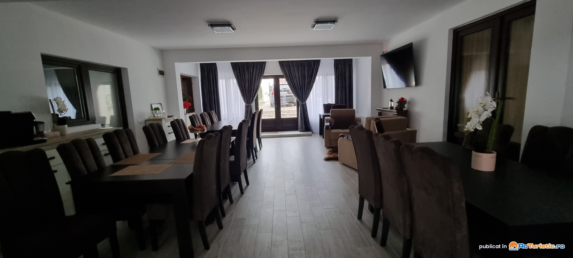 Pensiunea dispune de 6 dormitoare cu baie proprie, iar la parter, veți găsi băi suplimentare, o sală de mese spațioasă, locul ideal pentru a vă bucura de preparatele delicioase pregătite în bucătăria complet utilată.