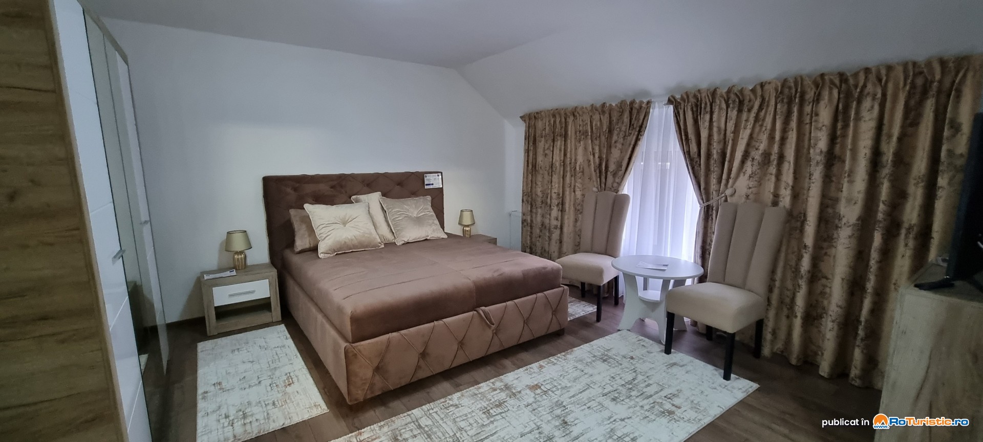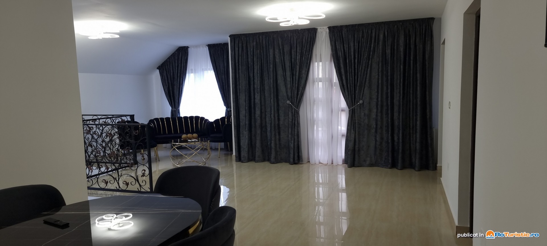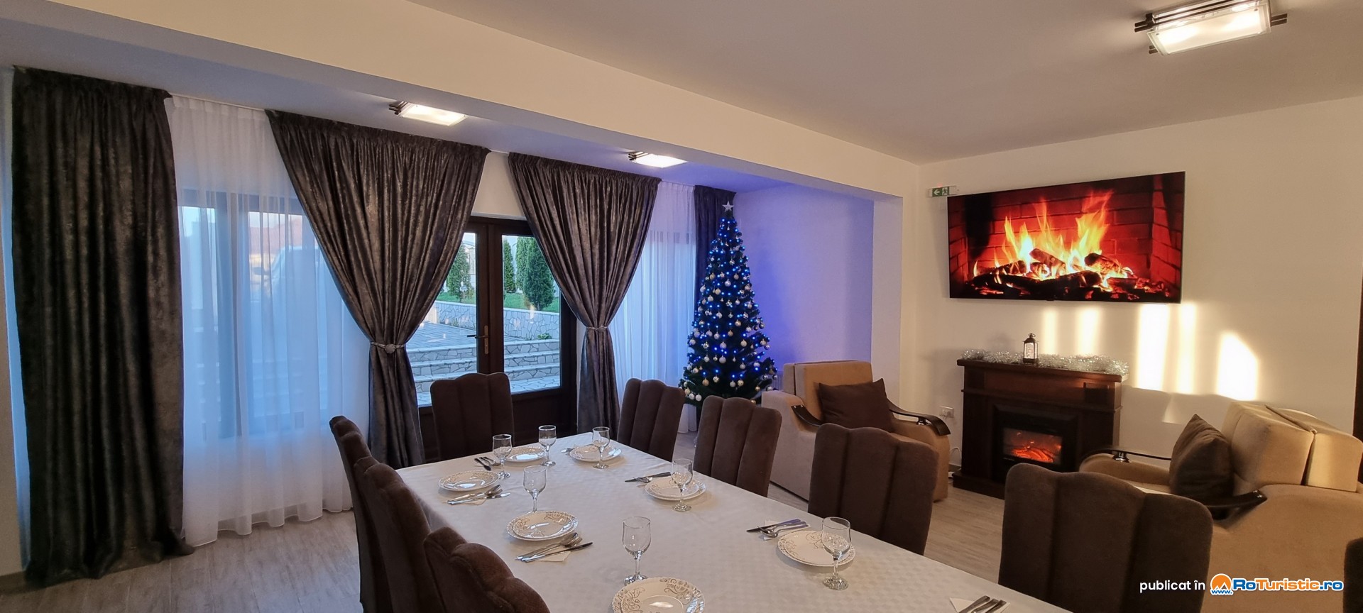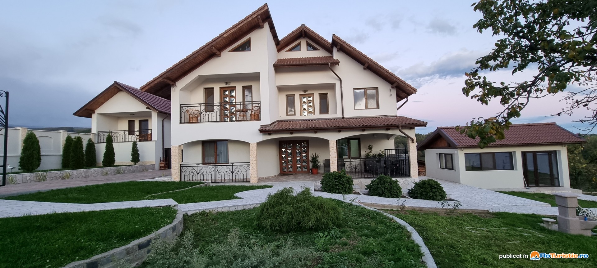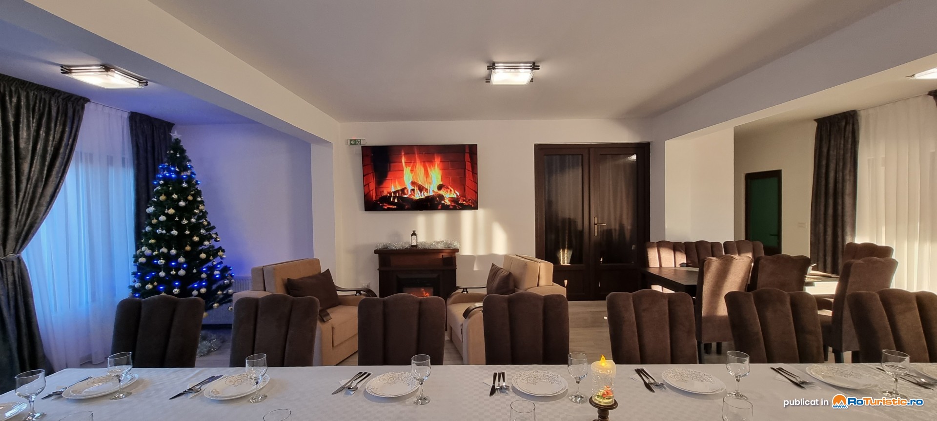 Pensiunea dispune de 6 dormitoare cu baie proprie, iar la parter, veți găsi băi suplimentare, o sală de mese spațioasă, locul ideal pentru a vă bucura de preparatele delicioase pregătite în bucătăria complet utilată.