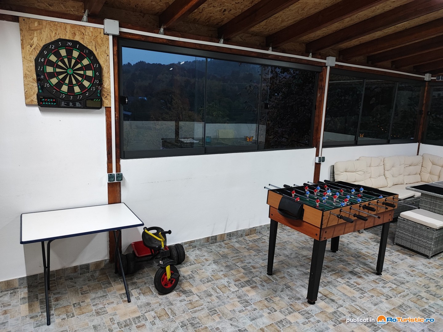 Foișorul nostru este echipat cu grătar, sobă pe lemne și cuptor incorporat, veselă, tacâmuri, un aparat de cafea, 2 ceaune de mărimi diferite, colțar și o masă mare, este locul perfect pentru a savura preparatele delicioase la grătar în timp ce vă bucurați de compania prietenilor sau a familiei. Distracția continuă cu diverse activități disponibile, precum Darts, masă de fotbal, și o varietate de jocuri în aer liber.