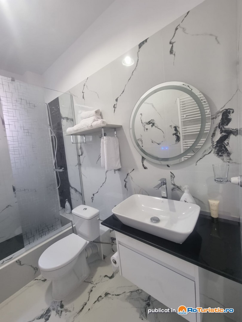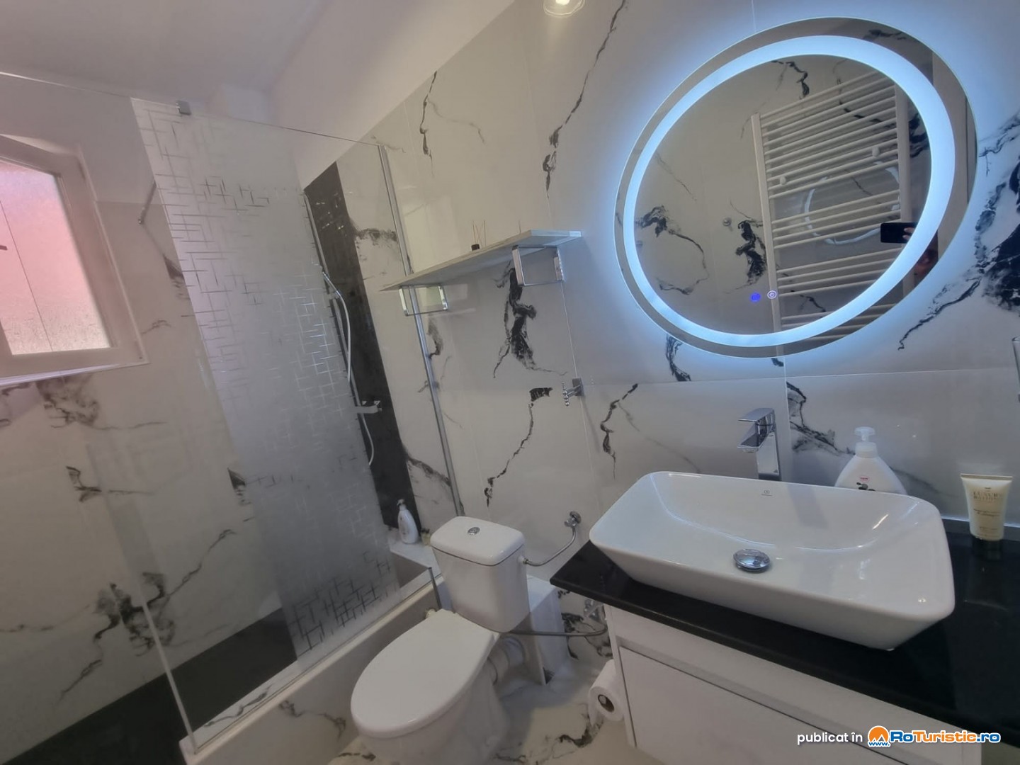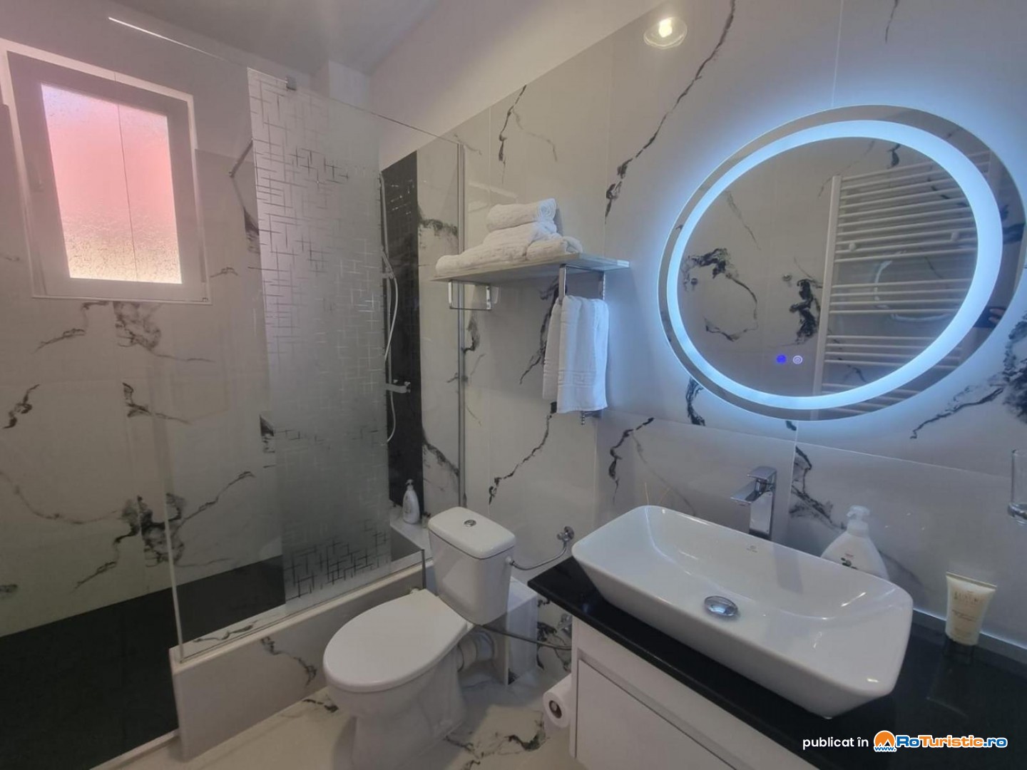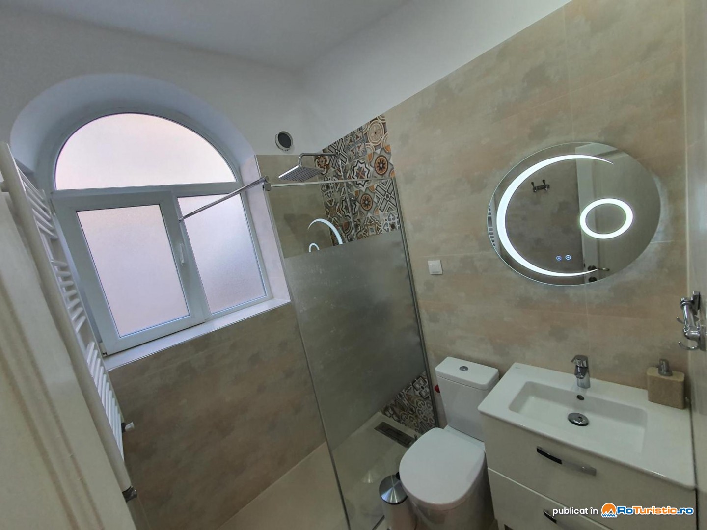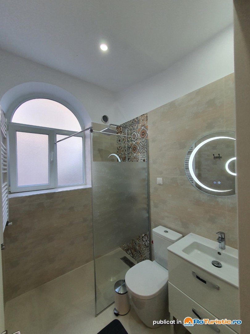 ✔️ Apartamentul nr. 2 – Luna Residence Terrace este situat la parterul vilei, cu acces direct din curte și terasă exterioară. Apartamentul are două dormitoare, living, bucătărie complet utilată și două băi. Capacitatea este de 6–8 persoane. Baia principală are duș walk-in, iar a doua baie este dotată cu cabină de duș.
