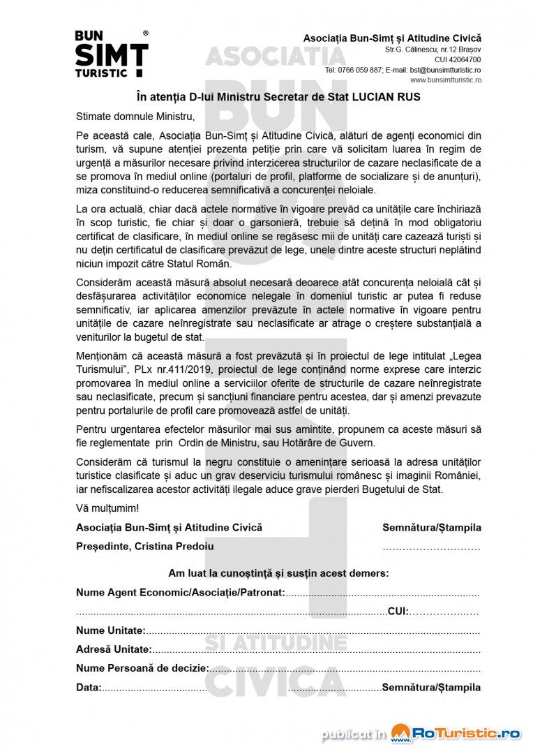 Acestui demers s-a alăturat portalul de promovare roturistic.ro, primul portal de profil care promovează doar unități turistice clasificate, și aproape 300 de proprietari de unități turistice clasificate din toate colțurile țării, care au semnat petiția inițiată de Asociația Bun-Simț și Atitudine Civică.